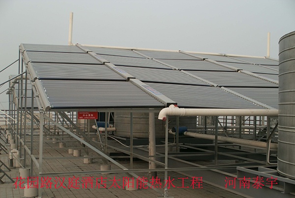 漢庭酒店:該圖為鄭州漢庭商務(wù)酒店太陽(yáng)能熱水系統(tǒng)施工完畢圖,太陽(yáng)能集熱面積約220m2,本項(xiàng)目采用力諾真空集熱管太陽(yáng)能與燃?xì)忮仩t相結(jié)合,屬于節(jié)能環(huán)保項(xiàng)目,年節(jié)能率高達(dá)百分之80以上。該熱水項(xiàng)目晴好天氣時(shí)每天可產(chǎn)16T左右的熱水,完全可以滿足甲方使用要求,達(dá)到大節(jié)能效果。