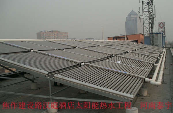 焦作解放路漢庭酒店:該圖為焦作漢庭商務酒店太陽能熱水系統(tǒng)施工完畢圖,太陽能集熱面積約170m2,本項目采用力諾真空集熱管太陽能與燃氣鍋爐相結合,屬于節(jié)能環(huán)保項目,年節(jié)能率高達百分之80以上。該熱水項目晴好天氣時每天可產12T左右的熱水,完全可以滿足甲方使用要求,達到大節(jié)能效果。