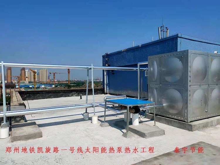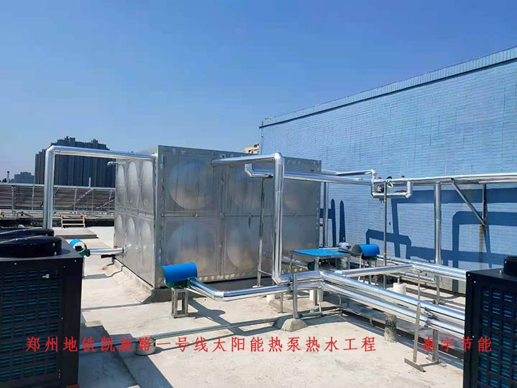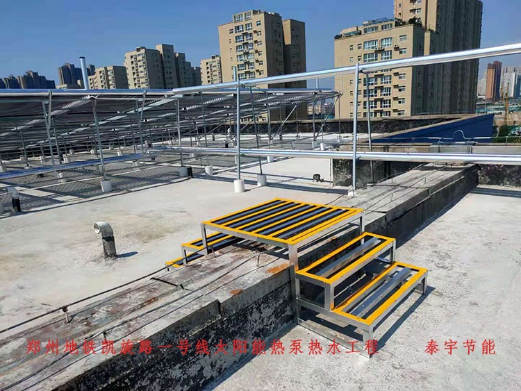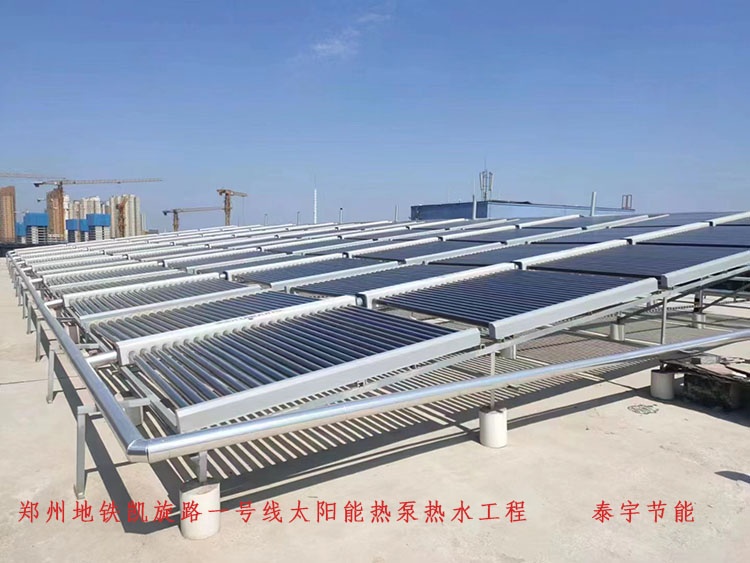 鄭州地鐵一號(hào)線凱旋路熱水工程由太陽能和空氣能組成,太陽能集熱面積約為300平方,主要滿足食堂用水及列車員住宿樓生活熱水所需。晴好天氣時(shí),日產(chǎn)標(biāo)準(zhǔn)洗浴熱水不低于20T,強(qiáng)冷及陰雨天采用兩臺(tái)10P空氣能熱泵作為補(bǔ)充來滿足全年熱水所需。