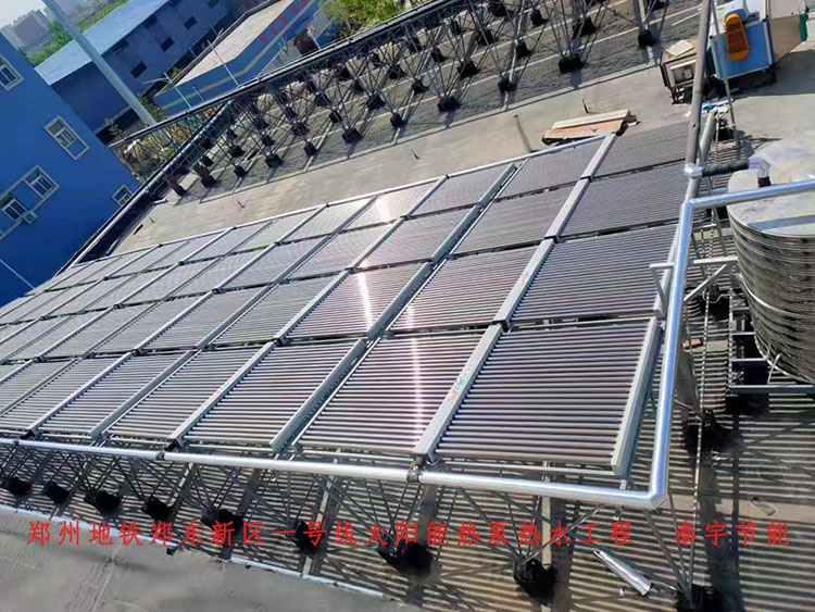 鄭州地鐵一號(hào)線鄭東新區(qū)熱水工程由太陽(yáng)能和空氣能組成,太陽(yáng)能集熱面積約為360平方,主要滿(mǎn)足食堂用水及列車(chē)員住宿樓生活熱水所需。晴好天氣時(shí),日產(chǎn)標(biāo)準(zhǔn)洗浴熱水不低于25T,強(qiáng)冷及陰雨天采用三臺(tái)10P空氣能熱泵作為補(bǔ)充來(lái)滿(mǎn)足全年熱水所需。