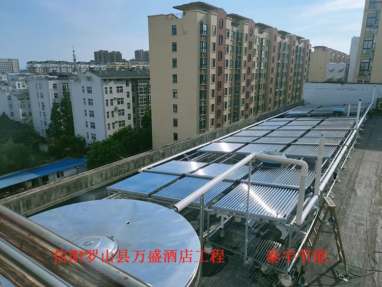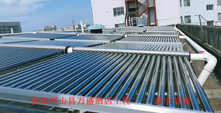 信陽羅山縣萬盛酒店共有客房90間左右,酒店生活熱水由太陽能和原有的燃?xì)忮仩t相結(jié)合共同提供。太陽能集熱面積約為140平方左右,主要滿足酒店日常洗浴熱水所需。晴好天氣時(shí),日產(chǎn)標(biāo)準(zhǔn)洗浴熱水不低于12T,強(qiáng)冷及陰雨天采用原有的燃?xì)忮仩t作為補(bǔ)充來滿足全年熱水所需。
