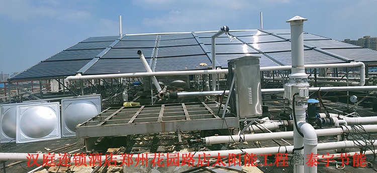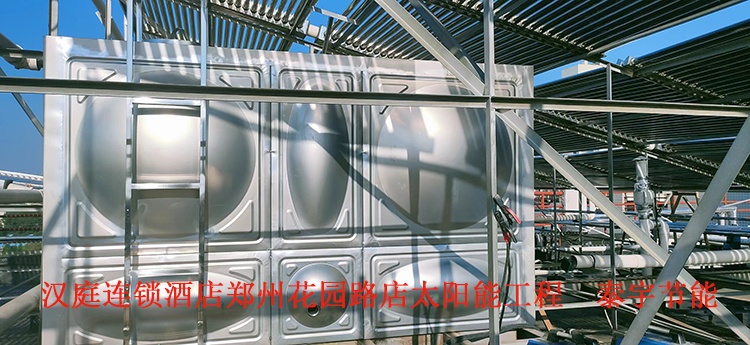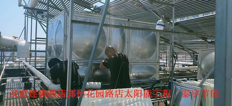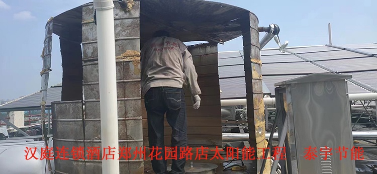 漢庭連鎖酒店鄭州花園路店太陽能保溫水箱更換中。該太陽能熱水工程已運行12年之久,舊的圓水箱由于漏水已下崗,新的方水箱已上任。整個太陽能系統(tǒng)運行12年之久,太陽能完好,水箱基礎(chǔ)完好,保溫水箱更換后,一切運行正常。
