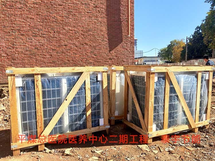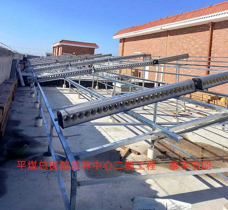 平煤總醫(yī)院醫(yī)養(yǎng)中心二期太陽能熱泵熱水項目共有兩棟樓康復(fù)樓及醫(yī)養(yǎng)樓??祻?fù)樓病房100多間,醫(yī)養(yǎng)樓病房200多間,兩棟樓日用熱水量約為60T,采用空氣能熱泵機(jī)組7臺,太陽能集熱面積約為4000平方左右,日產(chǎn)熱水量約為60T/日。