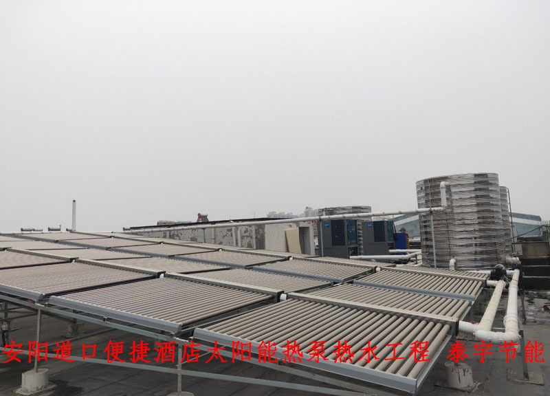安陽(yáng)道口城市便捷酒店位于滑縣道口人們 路,共有客房80多間,有太陽(yáng)能與空氣能熱泵機(jī)組相結(jié)合提供日常熱水供應(yīng)。太陽(yáng)能集熱面積約為100平方,美的熱泵機(jī)組10P兩臺(tái)。每天可提供標(biāo)準(zhǔn)洗浴熱水約為15T左右,完全可以滿足一年四季熱水需求。