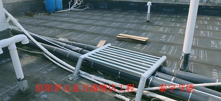 信陽(yáng)羅山縣萬(wàn)盛酒店共有客房90間左右,酒店生活熱水由太陽(yáng)能和原有的燃?xì)忮仩t相結(jié)合共同提供。太陽(yáng)能集熱面積約為140平方左右,主要滿足酒店日常洗浴熱水所需。晴好天氣時(shí),日產(chǎn)標(biāo)準(zhǔn)洗浴熱水不低于12T,強(qiáng)冷及陰雨天采用原有的燃?xì)忮仩t作為補(bǔ)充來(lái)滿足全年熱水所需。