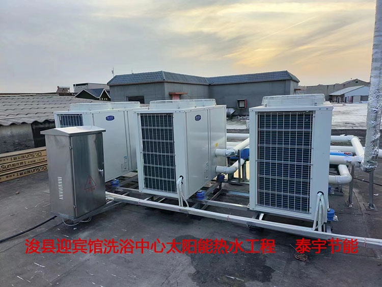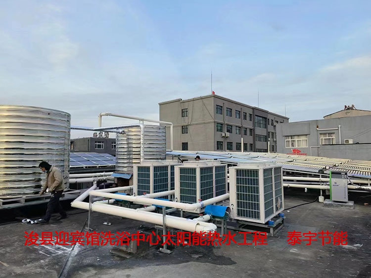 浚縣迎賓館洗浴中心共有淋浴頭20個左右,20恒溫大池一個。洗浴中心生活熱水由真管管太陽能和空氣能熱泵相結(jié)合共同提供。太陽能集熱面積約為240平方左右,空氣能采用10P機組三臺。主要滿足賓館日常洗浴熱水所需。晴好天氣時,日產(chǎn)標準洗浴熱水不低于25T,強冷及陰雨天采用空氣能作為補充來滿足全年熱水所需。