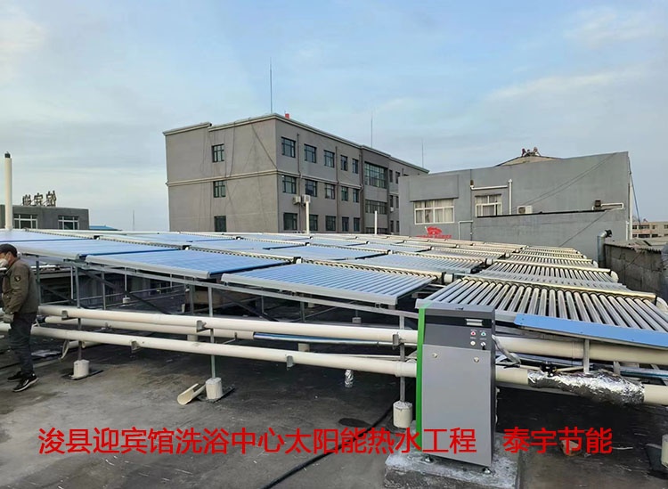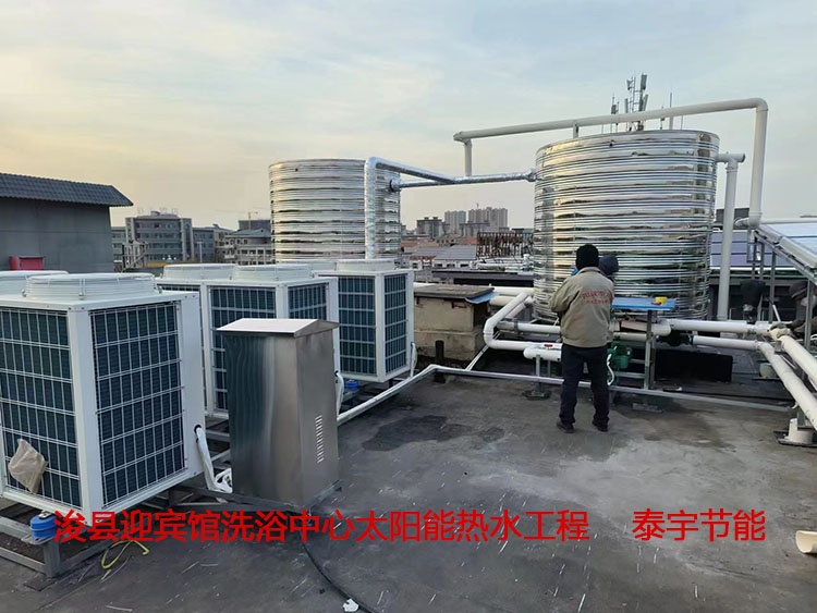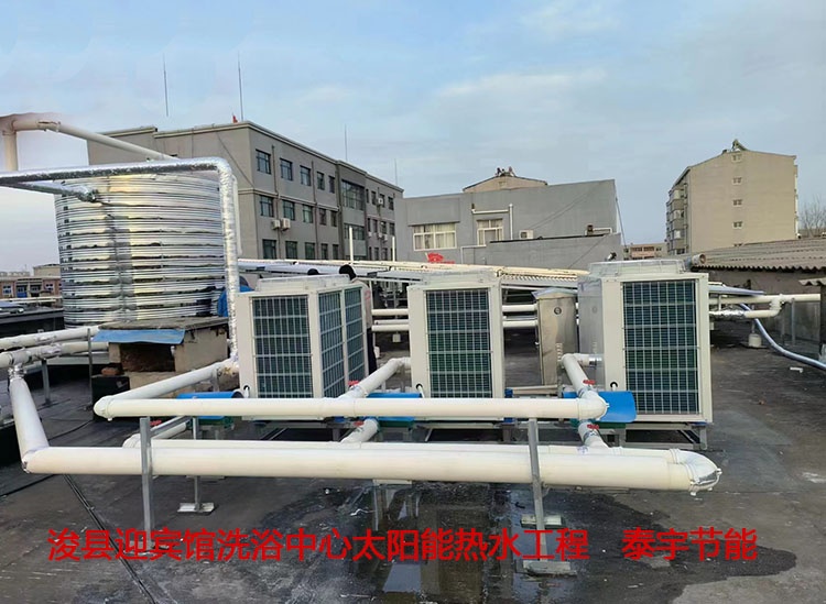 ??h迎賓館洗浴中心共有淋浴頭20個(gè)左右,20恒溫大池一個(gè)。洗浴中心生活熱水由真管管太陽能和空氣能熱泵相結(jié)合共同提供。